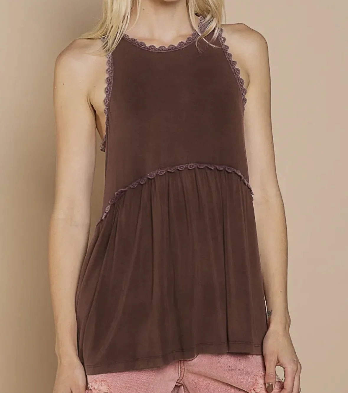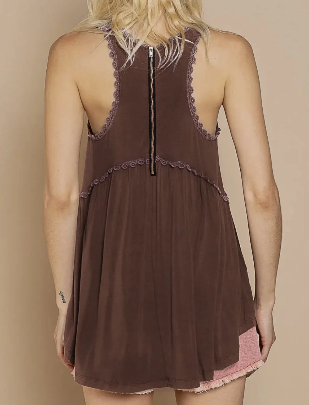 This sweet and simple baby doll knit top is perfect to be worn when you want to put a look together at any time. A must have item! Known for its softness of the garment with POL specialty wash. Designed in a relaxed sleeveless fit with round neck line, lace, crochet trim detailing on finish neck line, and armhole, flowy bottom with zipper closure on the racerback for easy wear.